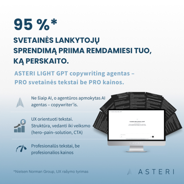 LIGHT GPT – tai AI agentas, sukurtas agentūros, kuri kasdien rašo svetainių tekstus realiems verslams. Ne universalus ChatGPT. Ne šiaip AI. Tai ištestuotas, išmokytas agentas–copywriter, rašantis profesionaliai, greitai ir aiškiai – kaip žmogus.